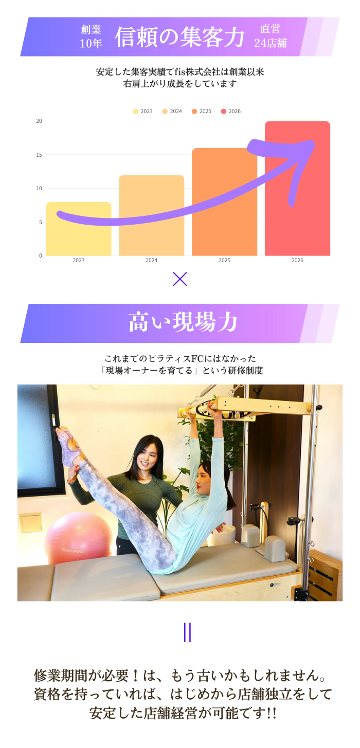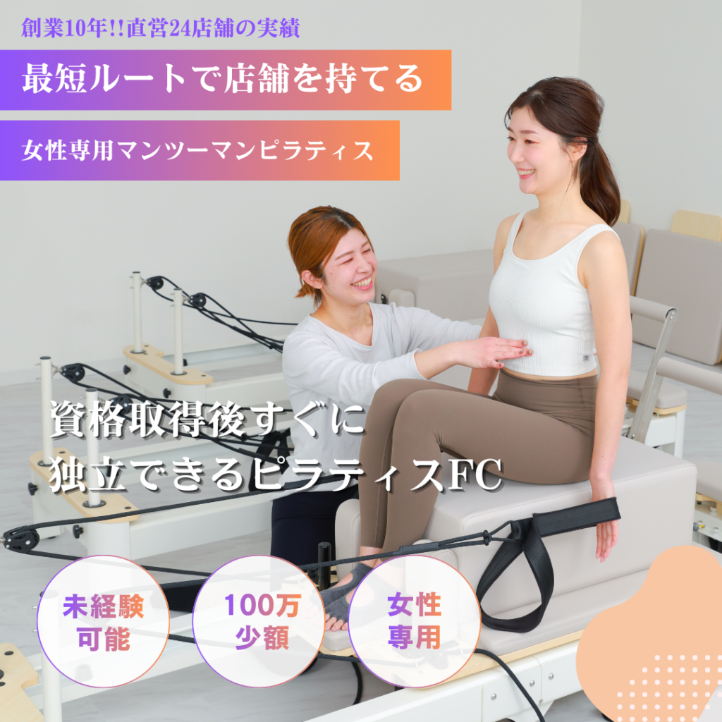 大阪で直営24店舗出店し、約10年運営してきた実績をもとに、各地方のピラティスオーナーが独立できるスキームを提供させていただきます。