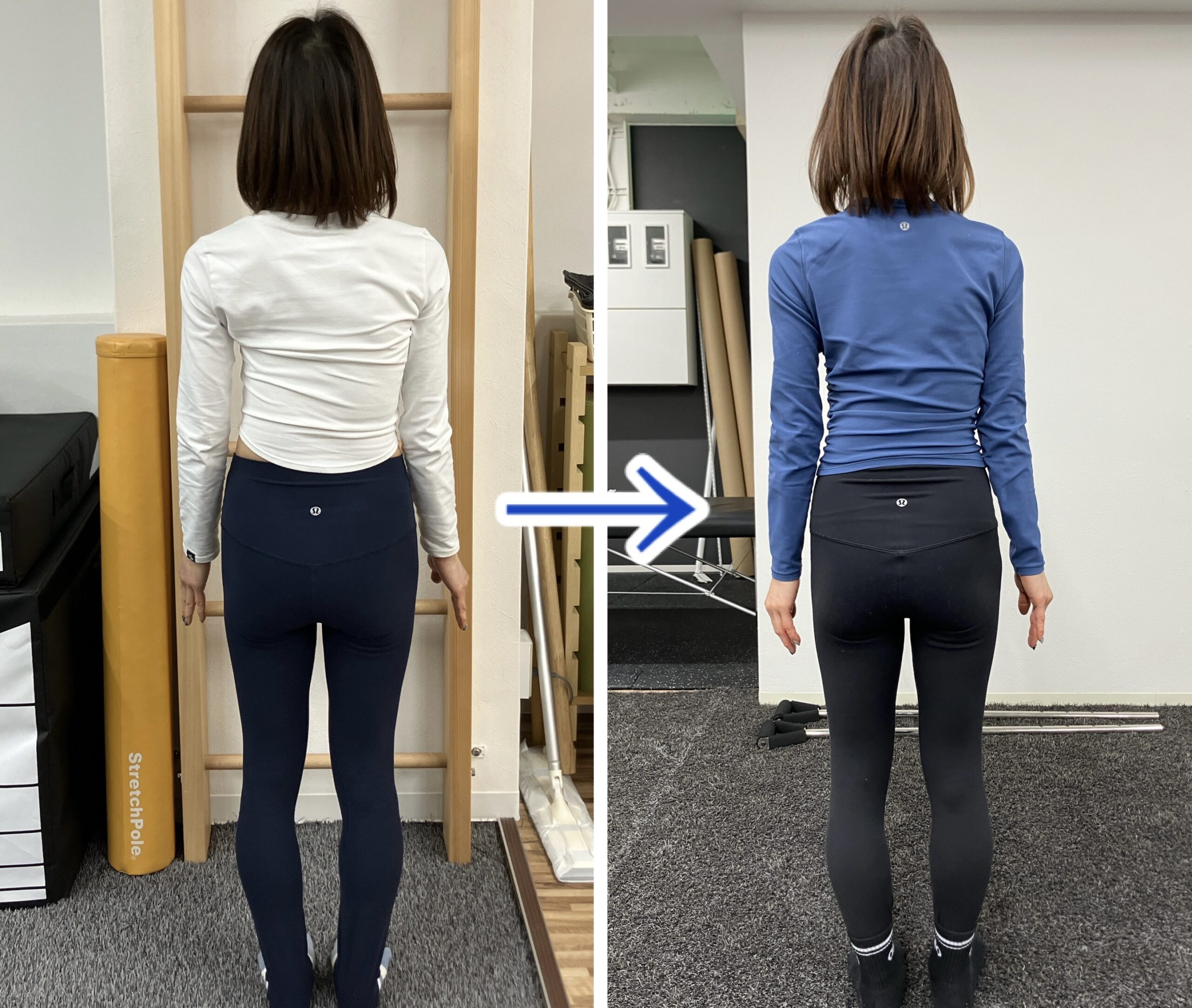 写真を見てもわかる通り、明らかに姿勢が変わっていることがわかると思います。側弯症で歪んでしまったものを完全に真っすぐに矯正することは難しいですが、マンツーマンピラティスでお客様の状態に合わせて体の使い方や呼吸の仕方、動いていないところを動かすなど、専門的な工夫により、これだけの変化を得られました。